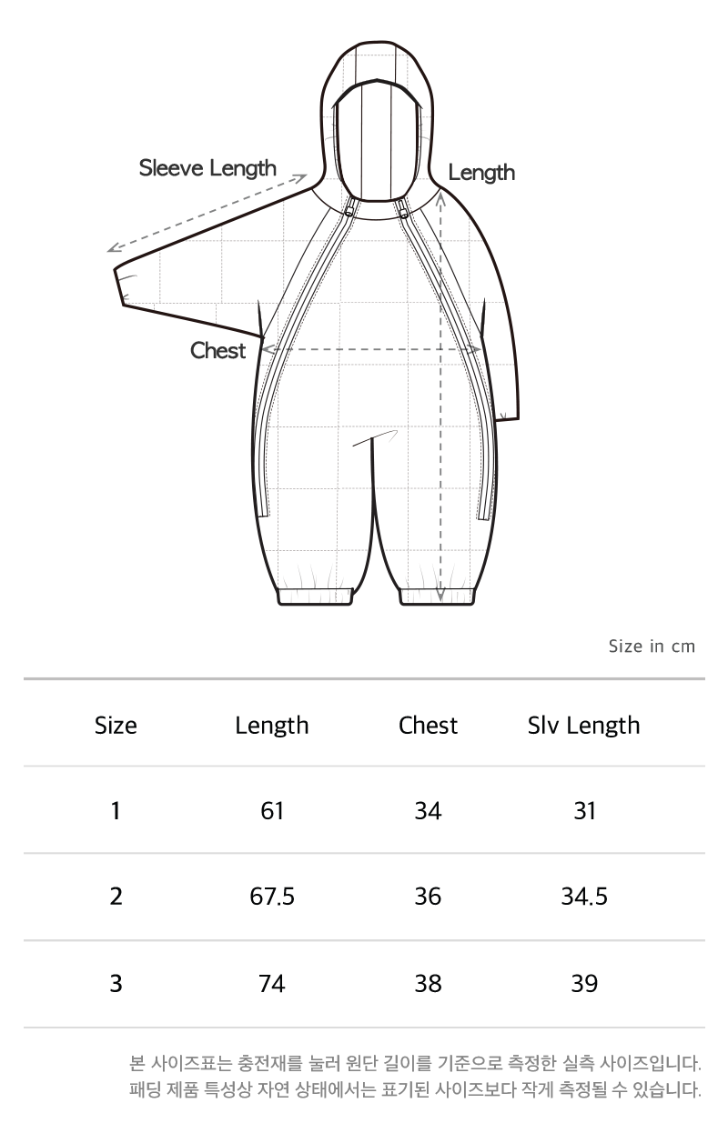 *현재 제공되는 실측 사이즈표는 다운 패딩 제품의 구조적 특성을 고려하여, 충전재의 볼륨이나 공기층과 관계없이 제품을 구성하는 원단 자체의 길이를 기준으로 측정한 실측 기준표입니다.