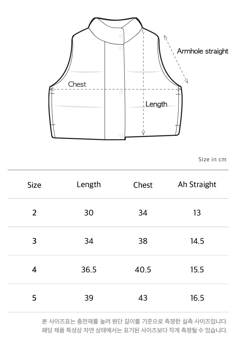 *현재 제공되는 실측 사이즈표는 다운 패딩 제품의 구조적 특성을 고려하여, 충전재의 볼륨이나 공기층과 관계없이 제품을 구성하는 원단 자체의 길이를 기준으로 측정한 실측 기준표입니다.